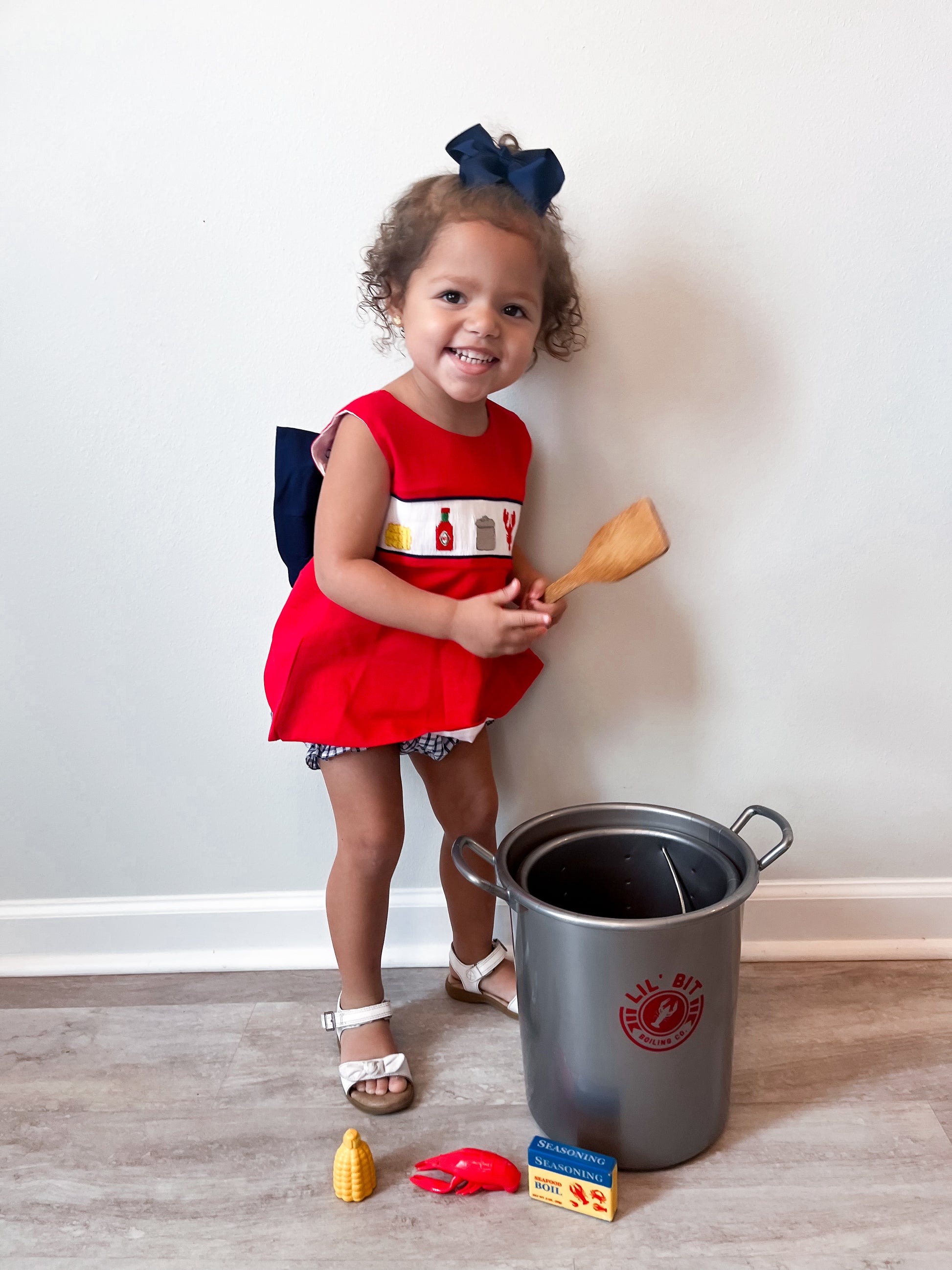 Smocked seafood set, bloomer shorts. Knit bow on the back