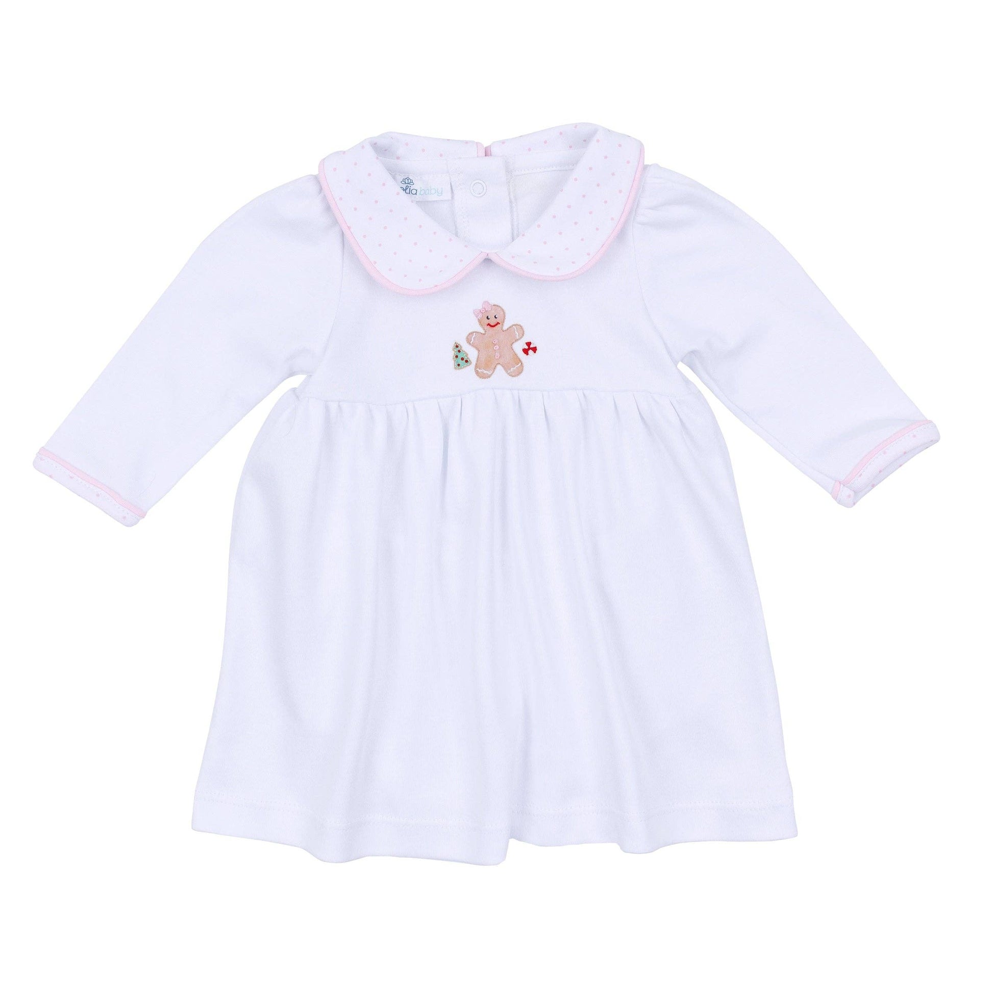 This delightful dress, crafted from luxurious white Pima Cotton, is perfect for any Christmas gathering. It features a gingerbread girl and a pink embroidered collar with minidots, creating a sweet silhouette that will make your little one shine. The long sleeves provide warmth for cooler days.